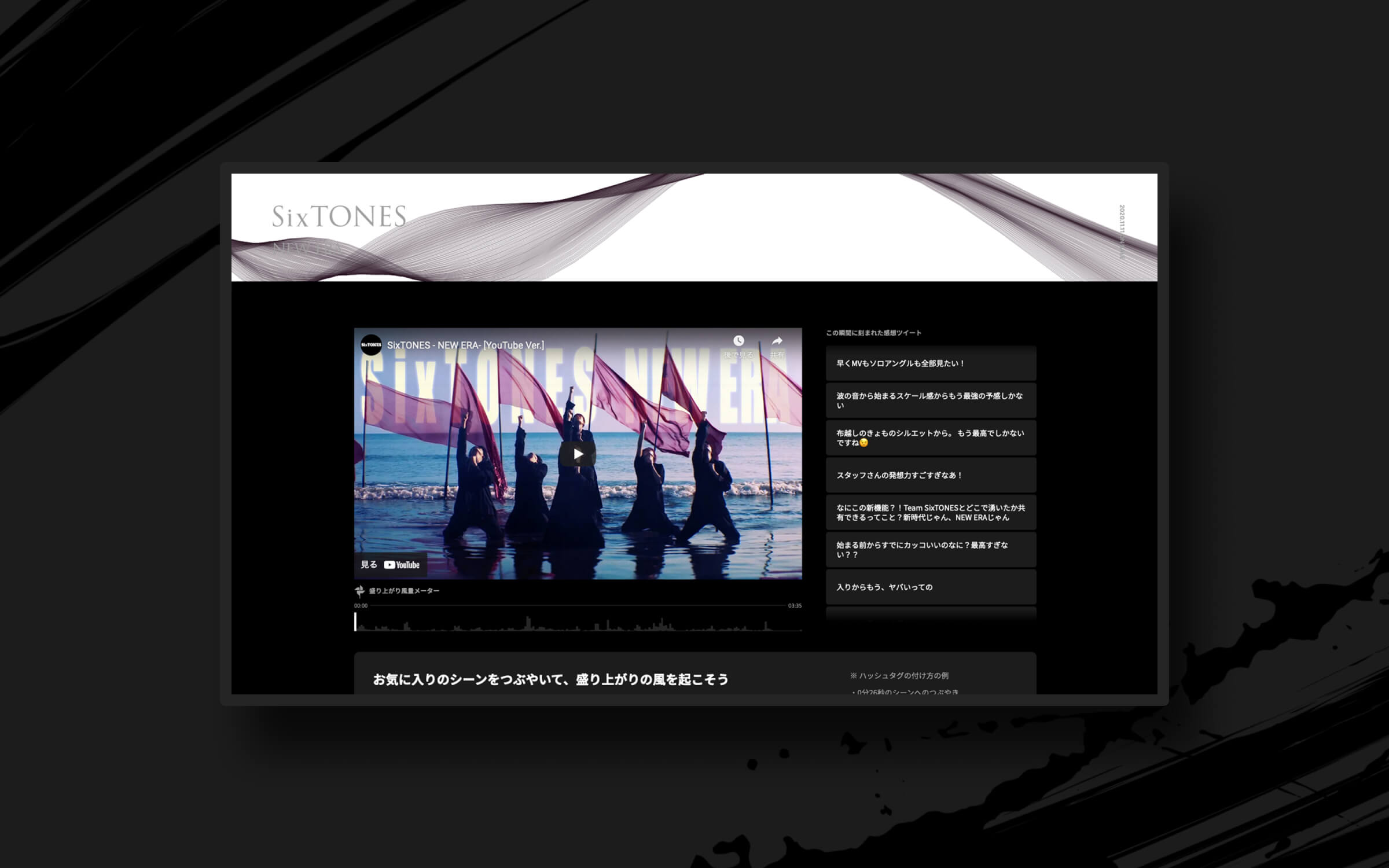この特設サイトではMUSIC VIDEOを見た人のお気に入りシーンへのつぶやきが収集され、感想として表示されます。ただ単に表示されるのではなく、MUSIC VIDEOの再生時間と連動し、つぶやきが多かったシーンではより多くの感想が表示される仕組みになっています。そして多くの感想が流れるシーンほどより大きな風が吹き荒れ、サイト上部に表示された大きな布が強くなびき始めます。これはMUSIC VIDEOの映像中でも特徴的だったなびく布をモチーフとしたものです。